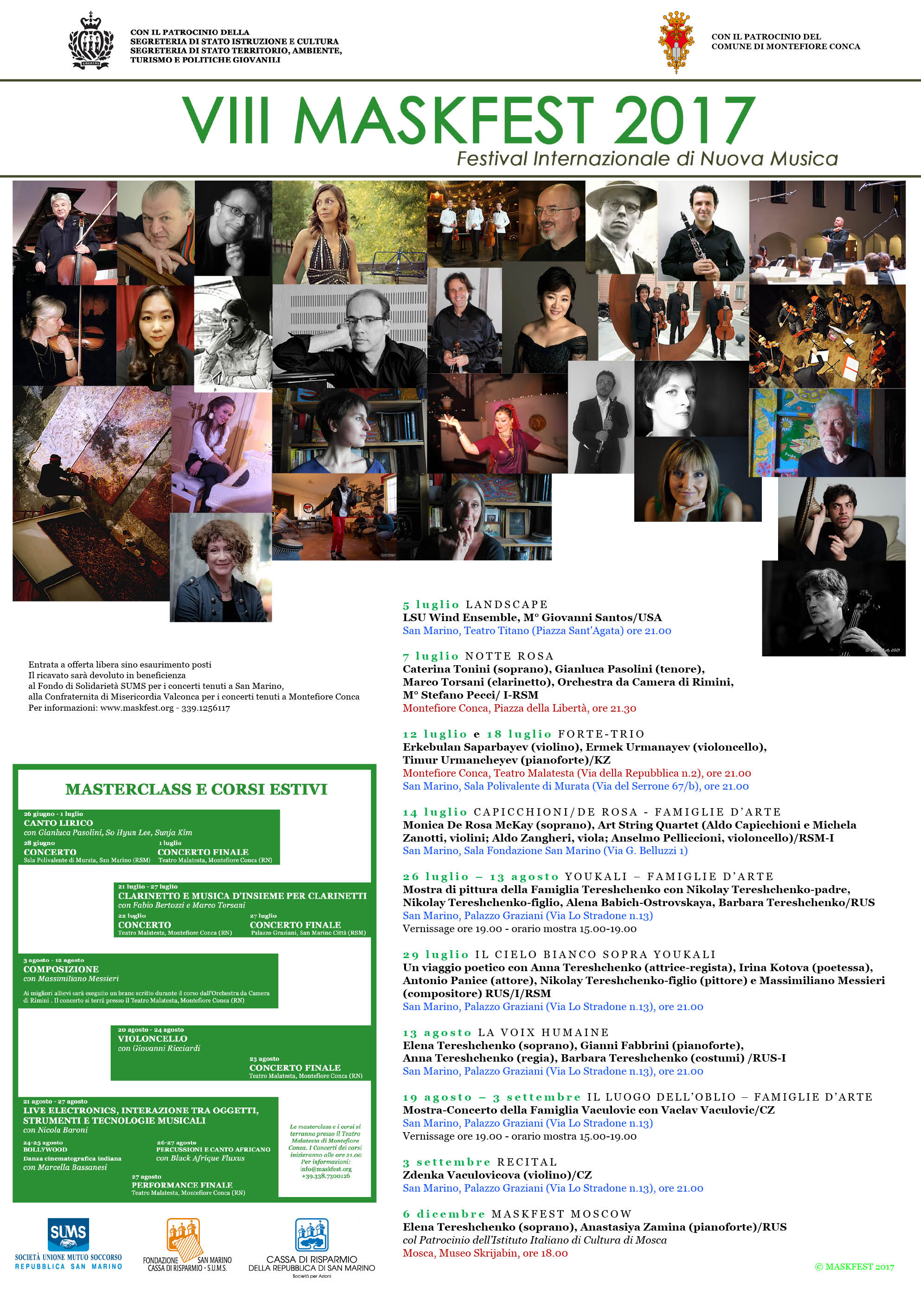 Gianluca Pasolini (I), So Hyun Lee (ROK), Sunja Kim (ROK), LSU Wind Ensemble (USA), Giovanni Santos (USA), Orchestra da Camera di Rimini (I), Stefano Pecci (I), Marco Torsani (RSM), Caterina Tonini (I), Forte Trio (KAZ), Monica De Rosa McKay (I) Capicchioni Family (RSM), Tereshchenko Family (RUS), Vaculovic Family (CZ), Giovanni Ricciardi (I), Fabio Bertozzi (I), Black Afrique Fluxus (RN/SN), Marcella Bassanesi (I) and other Maskfest Friends…