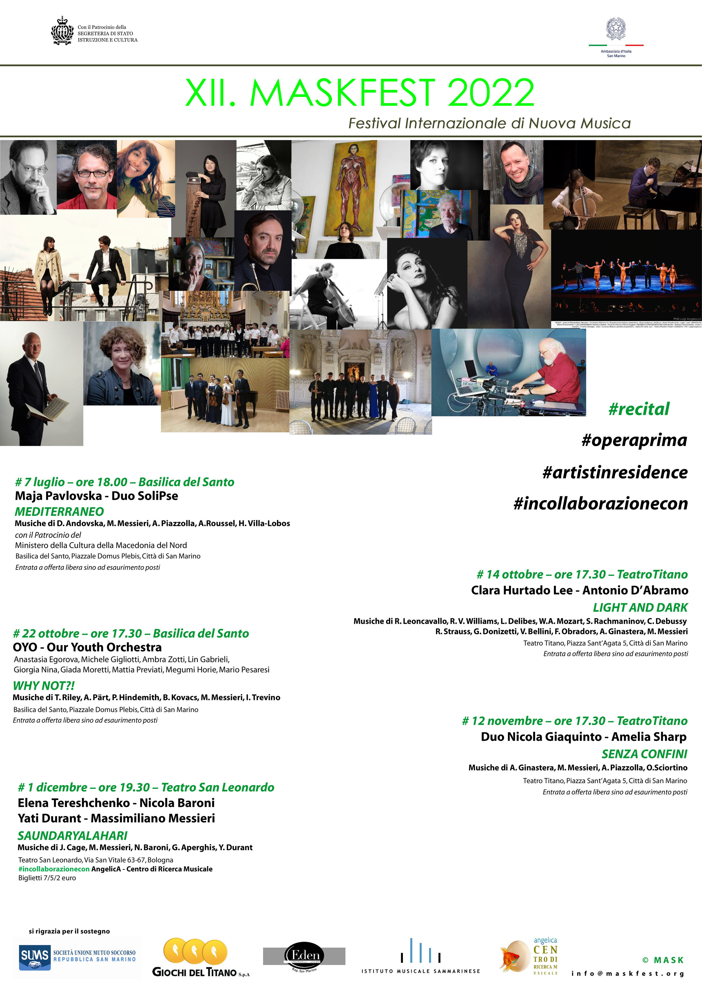 “Why not?!” with OYO – Our Youth Orchestra: Anastasia Egorova (soprano), Michele Gigliotti (clarinet), Ambra Zotti (sax), Lin Gabrieli and Giorgia Nina (marimba), Giada Moretti (cello), Mattia Previati (double-bass), Megumi Horie (organ), Mario Pesaresi (conductor) – Cathedral of San Marino