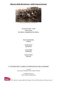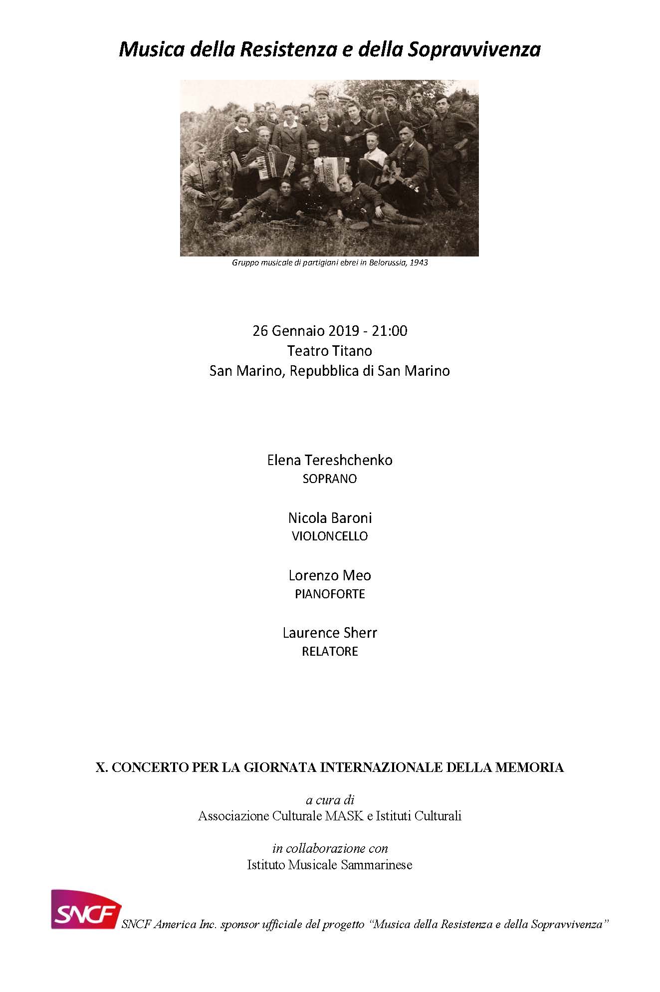 In occasione della Giornata Internazionale della Memoria il IX. MASKFEST dedica un concerto al progetto del compositore ebreo-americano Laurence Sherr dal titolo Music of Resistance and Survival, con Elena Tereshchenko, soprano; Nicola Baroni, violoncello; Lorenzo Meo, pianoforte; Laurence Sherr, relatore. Il concerto è in collaborazione con SNCF America, Inc., gli Istituti Culturali e l’Istituto Musicale Sammarinese. Ingresso gratuito.